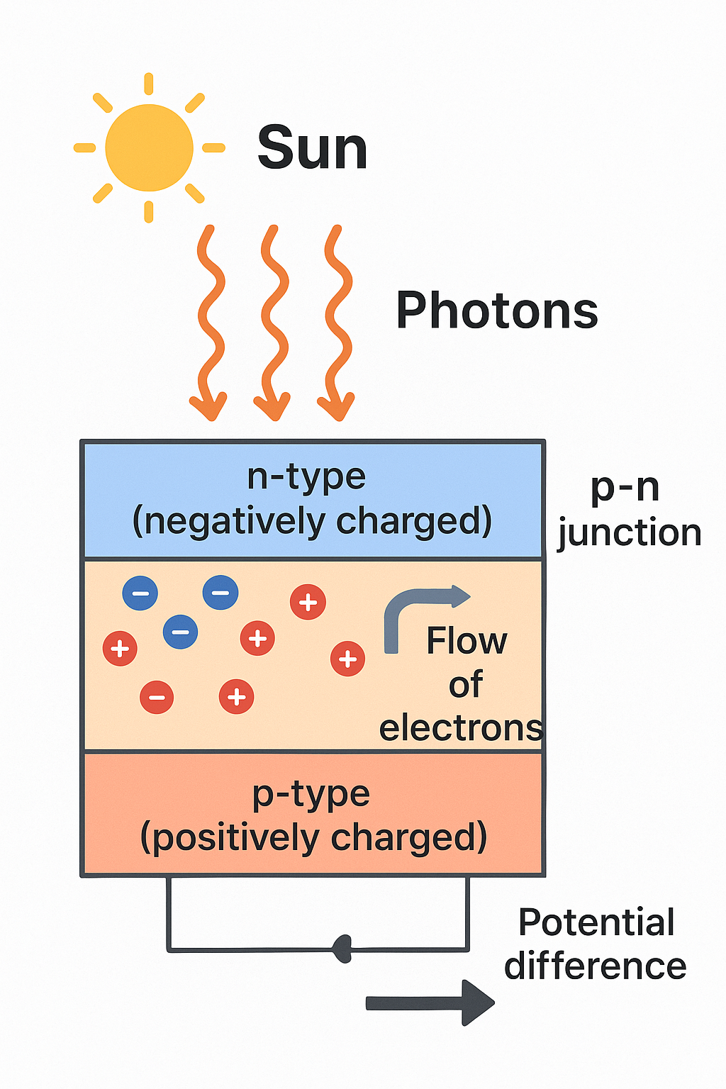 When the Sun's photons hit the surface, the electrons are energised and begin to move. The p-n junction electric field forces the electrons to one side and holes to the other.