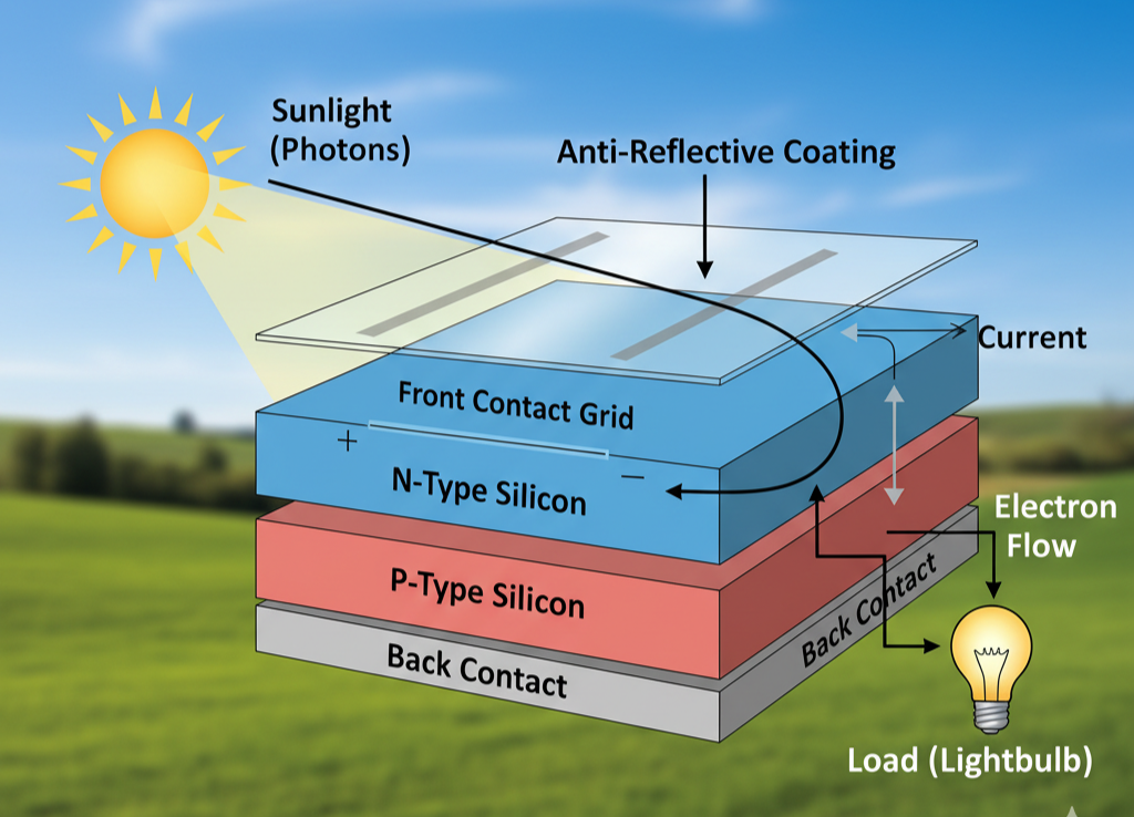 Crystalline Silicon Substrate: The base material where sunlight is absorbed and electron-hole pairs are generated.